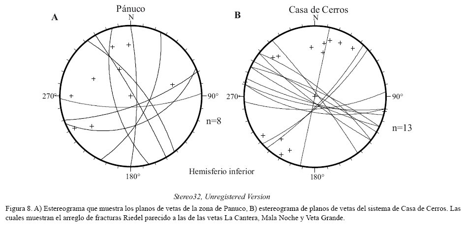 La veta Pánuco (VP) tiene un rumbo variable entre N3 5°-40°W con inclinación entre 60° y 75° al SW. Paralela a ella, hay fallas antitéticas con inclinación al NE (Figura 8A), con relleno de cuarzo de tonos azul pálido. Hay otro conjunto transversal de fallas-vetas que corresponden a fracturas R' . La VP presenta en sus plano estrías horizontales que marcan un movimiento lateral derecho y las estrías oblicuas de segunda generación sobrepuestas sobre las horizontales, muestran que la VP en esta segunda etapa, se comportó como una falla normal-oblicua izquierda, con pitch de 75° al SE. Actualmente las obras mineras en este sistema se encuentran inactivas.