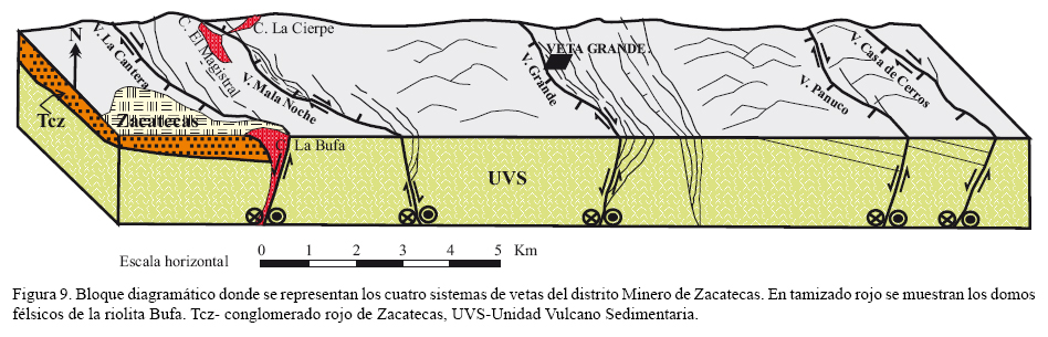 En el norte de la ciudad de Zacatecas, las rocas de la secuencia de la UVS, están cruzadas por cuatro fallas principales: La Cantera, Mala Noche, Veta Grande y Pánuco, donde se alojaron la gran mayoría de vetas del DMZ. La orientación general de esas fallas es de N50° - 60°W con inclinaciones de sus planos al SW y NE (Figuras 1 y 9).