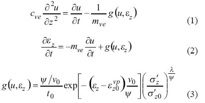where cve is a consolidation coefficient associated with elastic deformations, equal to k/(mveγw); γw is the unit weight of water, k is the soil's permeability and mve is the volumetric compressibility along the elastic portion of the one dimensional stress-strain curve, equal to ∂εze/∂σ'z= (κ/ν0)/(σ'z); ψ/v0= Cαε/2.3, where Cαε is the slope along the compressibility curve in log time versus strain; finally λ/ν0 is the slope of a reference one dimensional stress-strain curve.