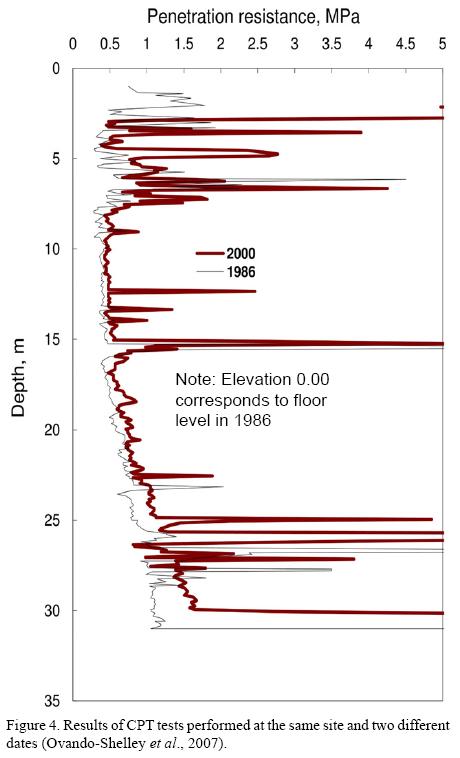 Field and laboratory data collected over the last few decades have been used to document the way in which mechanical and index properties change. The graph in Figure 3, for example, shows one dimensional compression curve obtained from testing of three samples retrieved from the same site at three different dates. As observed, initial void ratios have reduced gradually over the years and apparent preconsolidation pressures have decreased; the three samples exhibit approximately the same virgin consolidation line. Results of Cone Penetration Tests (CPT) show increasing point penetration resistance over a 14 year period, as illustrated in Figure 4. The CPT profiles in that figure also show changes in the thickness of the upper clay formation, of about 100 cm between 1986 and 2000. Compression of the upper clay formation contributes with approximately 50 to 60% of total settlements measured in the central part of the city.