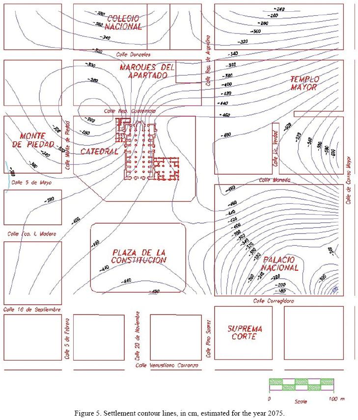 The resulting isochrone curves were used to obtain effective stress changes which were then used to calculate settlements in each of the studied sites. Deformations (compressions) of the two main clay strata were added to produce equal settlement contours at different dates. The map in Figure 5, for example, provides settlement contours estimated for the year 2075. The area covered includes the city's main square, the Metropolitan Cathedral, the National Palace and many other important architectonic monuments. As seen in the map, the calculated settlements are not uniform; differential settlements that will accumulate in the future are considerably large and will endanger several buildings of the zone.