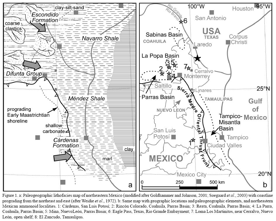 Correlations within the Late Cretaceous part of the Difunta Group are mostly isolated and tentative, including correlation with other coeval deep water and marginal marine deposits within Mexico (e.g., Cárdenas Formation in central-eastern Mexico, Schafhauser et al., 2007; Mendez Formation in eastern Mexico, Stinnesbeck et al., 1996), and with global sea-level changes (Lawton et al., 2001; Soegaard et al., 2003; Aschoff and Giles, 2005) as a result of the near-absence of age-diagnostic fossils in this deltaic complex. The ammonite assemblage collected at El Zancudo in the Mendez Formation thus opens a rare opportunity for correlation between shallow and deep water regimes in the region.