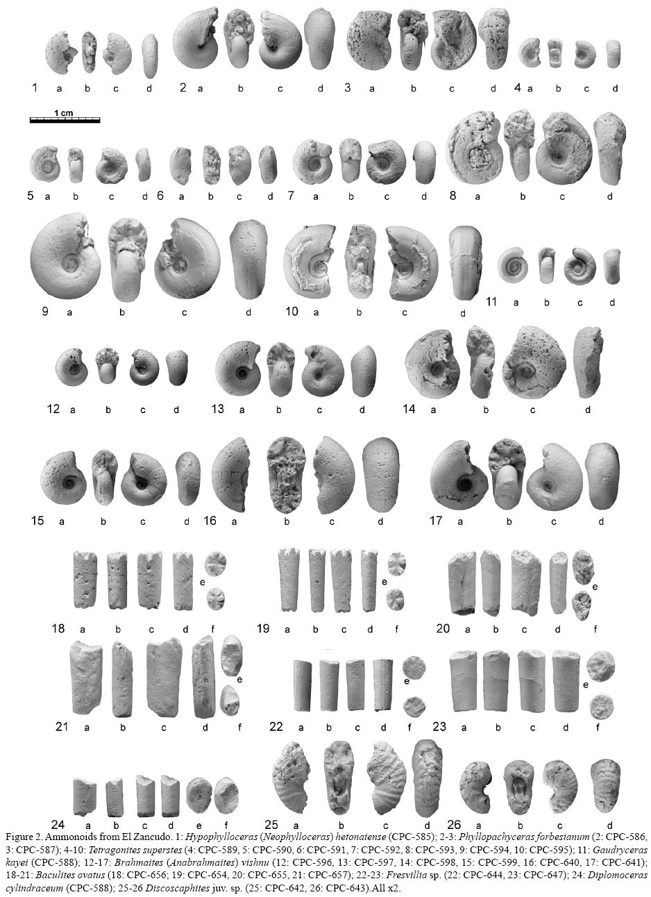 The age of the El Zancudo ammonite association can be further restricted by comparing the faunal composition to other assemblages described from northeastern Mexico. The species of these other assemblages are listed in Table 1 for comparison. For instance, the Zancudo fauna differs from the early Maastrichtian Cerralvo fauna in the absence of Nostoceras. Nostoceratids became extinct during the middle Maastrichtian (Goolaerts, 2010).