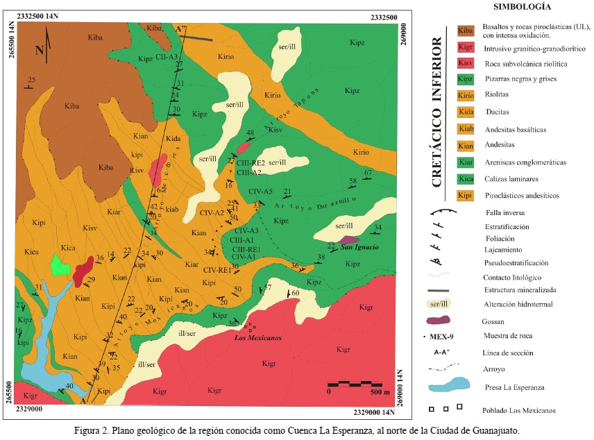 En este trabajo denominaremos en conjunto la FA y la UE como Secuencia Vulcanosedimentaria Mesozoica de Guanajuato (SVMG). La importancia de la UE radica en que aloja, a lo largo de la SG, varios indicios mineralizados de tipo VMS, además de presentar extensas zonas de alteración hidrotermal (Martínez-Reyes et al., 1995). Desde el punto de vista de exploración de yacimientos minerales, se han desarrollado estudios puntuales dentro de la UE (depósitos de El Gordo y Gavilanes; Hall y Torres-Gómez, 2000a,b); sin embargo, aún no se ha evaluado el potencial geológico-minero de su espesor total y ni de la parte basal de la SVMG (FA).