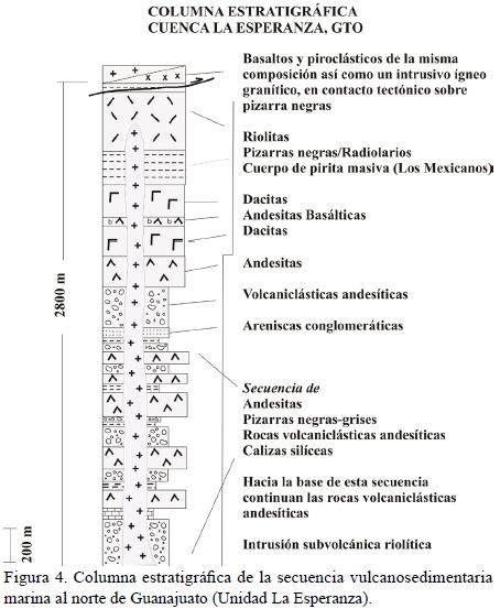 Las rocas que afloran al norte y en las inmediaciones de la Ciudad de Guanajuato, denominadas Unidad la Esperanza, constituyen una porción de la sección superior de la SVMG, ya que suprayacen estratigráficamente a la Formación Arperos. La SVMG se originó en un ambiente de cuenca de tras-arco (marginal) en la que se emplazaron basaltos de piso oceánico (FA), los cuales fueron cubiertos por series detríticas pelágicas con intercalacion de rocas piroclásticas y de lavas andesíticas a dacíticas-riolíticas hacia la cima (UE). Las rocas volcánicas de composición dacítica-riolítica, con intrusiones subvolcánicas graníticas asociadas, probablemente estén relacionadas con calderas submarinas que en sus etapas finales de formación pudieron haber desarrollado sistemas hidrotermales submarinos generadores de mineralizaciones VMS. Se estima que, incluyendo las series ofiolíticas (base de la cuenca de tras-arco), la SVMG podría alcanzar un espesor superior a los 4000 m.