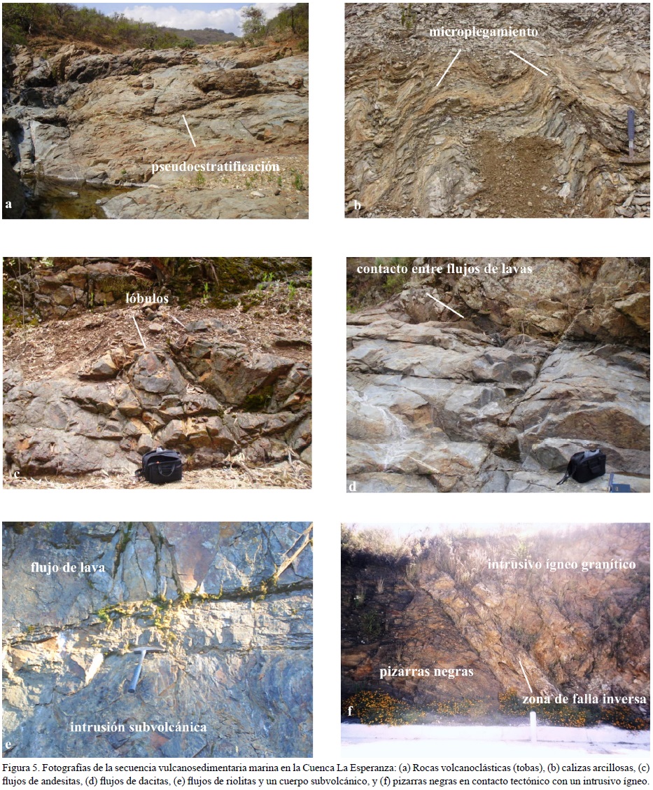 En este trabajo se propone que las rocas que afloran en la Cuenca de la Esperanza, correspondientes a la UE, representan una porción del intervalo predominantemente sedimentario de grano fino descrito por Corona-Chávez (1988) como la cima de la unidad metavolcánica de la región centro-sur de la SG. Así, la UE debería ser considerada la porción superior de la SVMG, estratigráficamente equivalente a la unidad sedimentaria de Quintero-Legorreta (1992) y suprayacente a la FA (Lapierre et al., 1992, Freydier et al., 1996). La UE en la zona de estudio, con un espesor estructural de 2800 m, se caracteriza por presentar un intervalo de lutitas negras, calizas y areniscas e intercalaciones de lavas andesíticas, además de piroclásticas de la misma composición, por encima un potente intervalo de lavas dacíticas-riolíticas con rocas piroclásticas submarinas de similar composición.