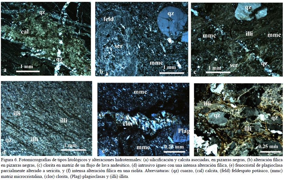 Sobreyaciendo a los flujos de lavas dacíticas, se observa un intervalo de ~ 460 m de lutitas negras (Figura 5f) con intercalaciones de 10 a 50 cm de areniscas, radiolaritas, limolitas y rocas piroclásticas de composición riolítica. Debido a la alteración hidrotermal y al intemperismo, estas rocas muestran coloraciones claras y tonos amarillentos. En esta porción de la secuencia se encajona el cuerpo de sulfuros masivos de tipo VMS de Los Mexicanos (también conocido como Mina San Ignacio), el cual está asociado a una intensa silicificación y a una zona de alteración fílica (Figura 6d), y está compuesto por pirita, calcopirita, esfalerita y galena.