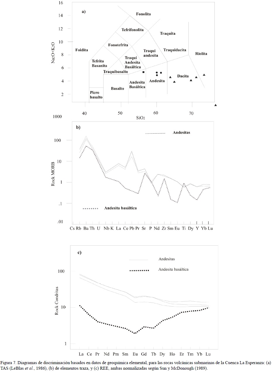 De acuerdo con su composición de elementos mayores (LeBlas et al., 1986), las rocas volcánicas identificadas en la secuencia son: andesitas basálticas, andesitas, dacitas y riolitas (Figura 7a). En conjunto estas rocas se clasifican como subalcalinas; sin embargo, la andesita basáltica y una muestra de dacita presentan un marcado enriquecimiento en hierro (Tabla 2), el cual puede ser atribuido a la clorita (chamosita) de origen hidrotermal. Se describen las andesitas por que permiten definir con mejor certeza el ambiente tectónico (cf. Gill, 1981; Winter, 2010).