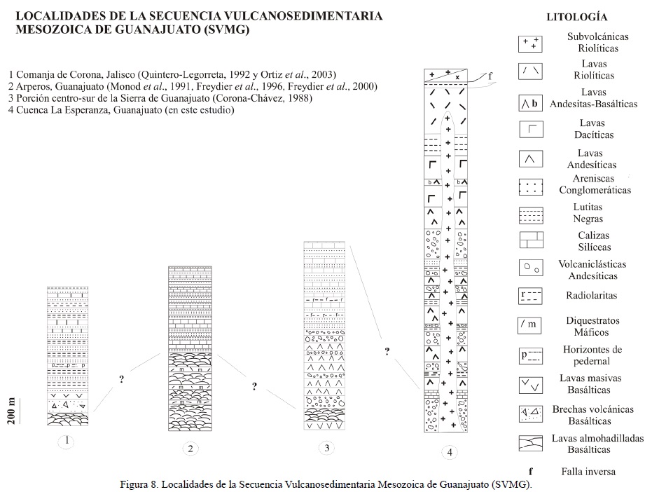 Se estima un espesor aproximado para toda la SVMG superior a los 4000 m, el cual ha sido determinado con base en una primera comparación regional de las columnas estratigráficas de Comanja de Corona (Quintero-Legorreta, 1992), del Centro-Sur de la SG (Corona-Chávez, 1988), de Arperos (Freydier et al., 1996, Ortiz-Hernández et al., 2003) y de Cuenca La Esperanza (en este trabajo) (Figura 8).