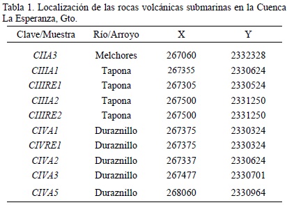 Se levantaron cuatro secciones estratigráficas (sobre los arroyos Melchores, Tapona, Duraznillo y Mexicanos) a semidetalle dentro de la porción superior de la SVMG (UE), al norte de la Ciudad de Guanajuato, en la zona conocida como Cuenca La Esperanza (área definida hidrográficamente por ser drenada por el Río Mexicanos y sus tributarios; Figura 2), de las cuales se seleccionó la primera por presentar un espesor mas completo. Durante la cartografía y levantamiento de la estratigrafía se tomaron un total de 30 muestras de roca, de las cuales fueron analizadas geoquímicamente 10 que corresponden a rocas volcánicas submarinas (Tabla 1). El estudio de petrografía se realizó a partir de láminas delgadas-pulidas de todas las muestras, en el Departamento de Recursos Naturales del Instituto de Geofísica (UNAM).