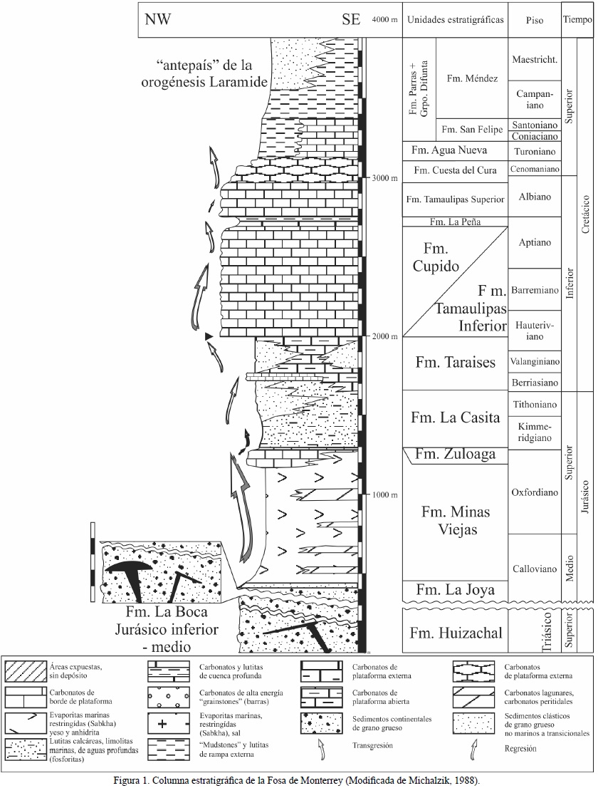 A continuación se describen brevemente, de la base a la cima, las secuencias clásticas de la columna estratigráfica en la Fosa de Monterrey, dentro del intervalo de edad del Triásico Superior al Cretácico Inferior. La descripción hace énfasis en los aspectos sedimentológicos, estratigráficos y petrológicos descritos por los trabajos de Michalzik, (1988; 1991), Michalzik y Shumann (1994), Ocampo-Díaz (2007), Ocampo-Díaz et al.. (2008, 2012) y Rubio-Cisneros (2008b).