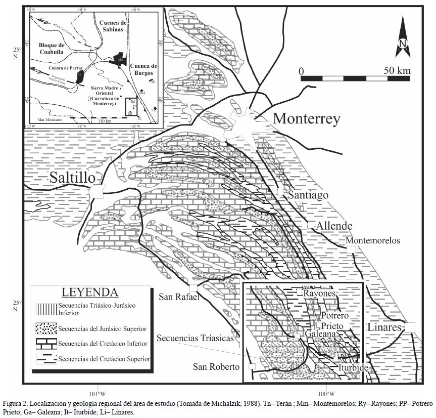 La región central del estado de Nuevo León es uno de los mejores lugares donde se pueden apreciar las secuencias clásticas de la columna estratigráfica de la Sierra Madre Oriental, en específico dentro de la Fosa de Monterrey. Las secuencias rocosas afloran principalmente en las inmediaciones de los poblados de San Pablo Tranquitas, Galeana y Rayones (Figura 2).