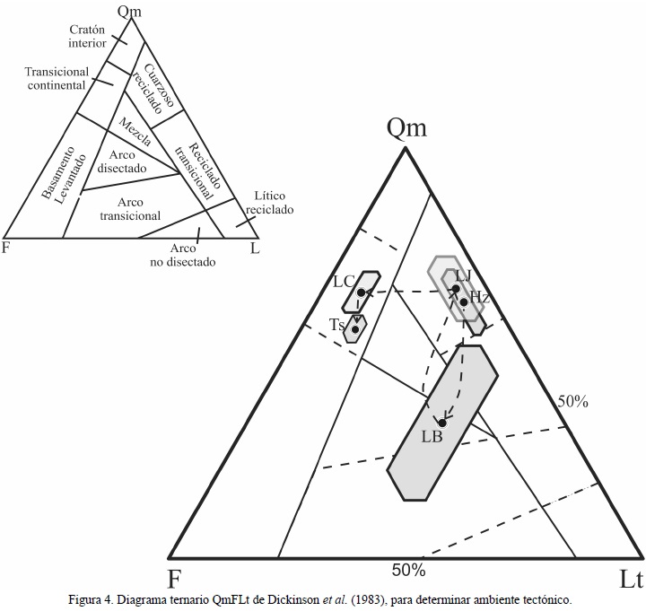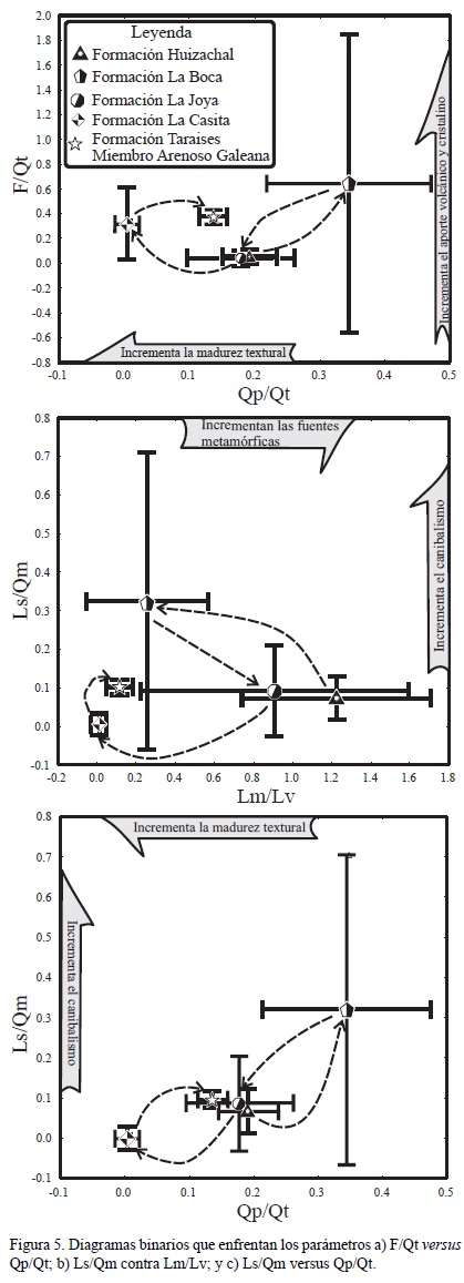 El diagrama QmFLt soporta las diferencias de composición entre las areniscas analizadas pudiendo observar que las muestras del: 1) Triásico Tardío (Formación Huizachal), son texturalmente las más maduras y mejor clasificadas, tienen una alta influencia de rocas metamórficas de grado bajo a alto, volcánicas y en menor proporción de rocas sedimentarias y plutónicas; 2) Jurásico Temprano (Formación La Boca), exhiben el mayor incremento de líticos volcánicos y feldespatos en toda la secuencia sedimentaria; 3) Jurásico Medio−Tardío (formaciones La Joya y La Casita), presentan un incremento en el contenido de cuarzo monocristalino (Qm) y cuarzo monocristalino con bordes de crecimiento sintaxiales; 4) Jurásico Tardío (Formación La Casita) presentan incrementos en el contenido de feldespatos, líticos volcánicos, líticos sedimentarios y cuarzo monocristalino con bordes de crecimiento sintaxiales; y 5) Cretácico Temprano (Miembro Arenoso Galeana de la Formación Taraises), revela un incremento en el contenido de feldespatos, líticos volcánicos y metamórficos (Figura 4).