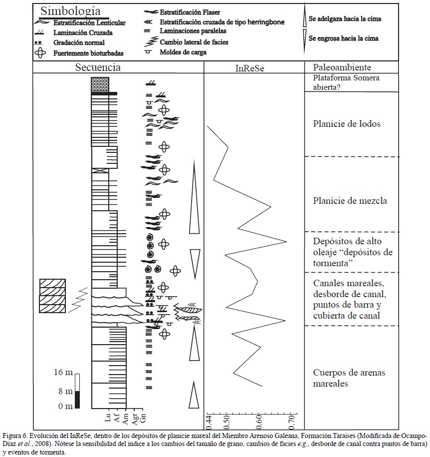 De acuerdo con Klein (1971) y Dalrymple et al.. (1992, 2006), los depósitos y ambientes sedimentarios relacionados con mareas son procesos alocíclicos. Las planicies mareales se encuentran muy influenciadas por los procesos autocíclicos como son la dimensión y sinuosidad de los canales o tamaño de grano, además de procesos alocíclicos que incluyen tormentas o periodos de alto oleaje. Partiendo de este concepto, los valores del InReSe en depósitos mareales más las observaciones sedimentológicas realizadas por Ocampo-Díaz et al.. (2008), permiten interpretar lo siguiente: 1) los depósitos basales muestran patrones con variaciones con alternancia y repetición relacionadas a procesos autocíclicos, por las diferencias en el tamaño de grano (areniscas finas a medias; Figura 6), y alocíclicos que favorecieron el reciclamiento mareal validado por la presencia de lodos acoplados (Figura 6); 2) las muestras colectadas en los depósitos influenciados por canales mareales muestran un incremento en los valores del InReSe, indicando su conexión a procesos autocíclicos relacionados con la clasificación hidráulica de partículas en tamaño de grano (areniscas muy gruesas-microconglomerados), y el reciclamiento por acción de los canales mareales (e.g., Allen, 1985); 3) los valores del InReSe son sensibles y disminuyen ante los procesos de desborde de canal, mostrando su relación autocíclica; por el contrario los valores se incrementan en las facies de desborde de canal; y 4) otra evidencia del incremento del InReSe para los procesos alocíclicos vinculados con canibalismo y/o reciclamiento es en los depósitos ligados a tormentas (Figura 6).
