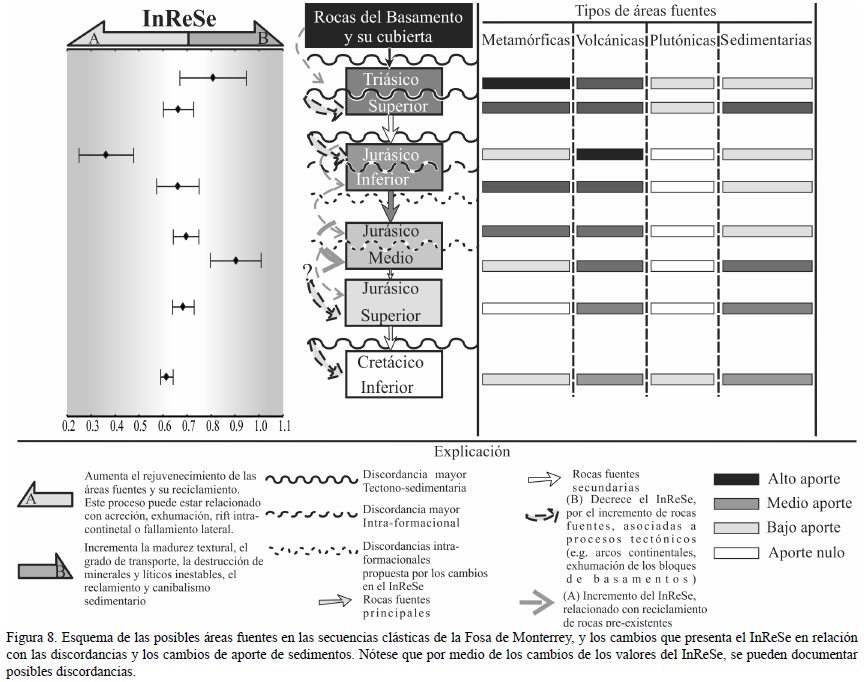 3. El límite Triásico-Jurásico entre las Formaciones Huizachal y La Boca en la Fosa de Monterrey está representado por una discordancia angular-erosiva, vinculada a los procesos extensivos durante la apertura del Golfo de México (Michalzik, 1988; Ocampo-Díaz, 2012; Rubio-Cisneros, 2012). Estas interpretaciones son consideradas por algunos para representar a la Formación la Boca como la progradación de un sistema fluvial a otro de tipo aluvial durante la etapa extensiva (e.g., Michalzik, 1991). Si la hipótesis anterior fuese acertada los valores del InReSe debiesen ser similares o más elevados que los que muestra la Formación Huizachal, indicando un reciclamiento o mayor grado de transporte. Sin embargo, la Formación La Boca muestra los más bajos valores de InReSe de la columna estratigráfica estudiada. La disminución en los valores del índice de reciclamiento sedimentario (~ 0.37; Tabla 1) indica el aporte de material clástico de nuevas áreas fuentes con carácter volcánico, metamórfico y plutónico (Figura 8). Los resultados son soportados por la propuesta de varios autores para relacionar a la Formación La Boca con características sedimentológicas de cuencas sedimentarias en arcos continentales de tipo andino de carácter extensional. Las cuencas se alojaron en la margen paleopacífica de México y favorecieron el rejuvenecimiento de las áreas fuentes, además del incremento de líticos volcánicos (e.g., Pindell y Dewey, 1982; Barboza-Gudiño, 2008; Barboza-Gudiño et al.., 2008; Gray y Lawton, 2008; Rubio-Cisneros y Lawton, 2011; Ocampo-Díaz, 2012; Zavala-Monsiváis et al.., 2012; Figura 8).