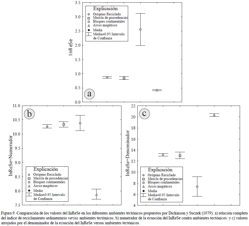 Se analizaron las 88 muestras documentas por Dickinson y Suczek (1979) para documentar el comportamiento de los valores del índice de reciclamiento sedimentario en función del ambiente geotectónico. De acuerdo con estos autores, el total de las muestras representan cuatro ambientes tectónicos principales: 1) bloques continentales, 2) orógenos reciclados, 3) mezcla de procedencias y 4) arco magmático. Los valores promedio de InReSe para cada ambiente son de ~ 2.6 para los bloques continentales, ~ 0.8 en orógenos reciclados, ~ 0.7 para las procedencias mezcladas y ~ 0.4 para los arcos magmáticos (Figura 9).
