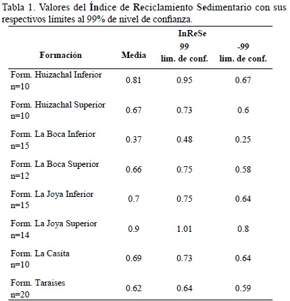 Los resultados del análisis del índice de reciclamiento sedimentario indican que cuando los valores del denominador disminuyen (e.g., feldespatos y/o líticos volcánicos), se incrementan los elementos indicadores de transporte y madurez textural (e.g., cuarzo monocristalino); en este caso los valores obtenidos son mayores a 0.6 hasta 5. Por el contrario, cuando los valores del numerador disminuyen se incrementan los valores del denominador relacionados con el aumento de constituyentes inestables como son feldespatos, plagioclasas. Por lo tanto, mientras los valores del InReSe sean más cercanos a cero existirá un mayor aporte de elementos inestables en los sedimentos. Las observaciones a los resultados del InReSe lo clasifican como un cálculo sensible que permite interpretar los cambios en la composición del área fuente, el canibalismo/reciclamiento, las modificaciones relacionadas con la diversidad de las facies, así como también los cambios ligados a las discordancias tectono-sedimentarias.