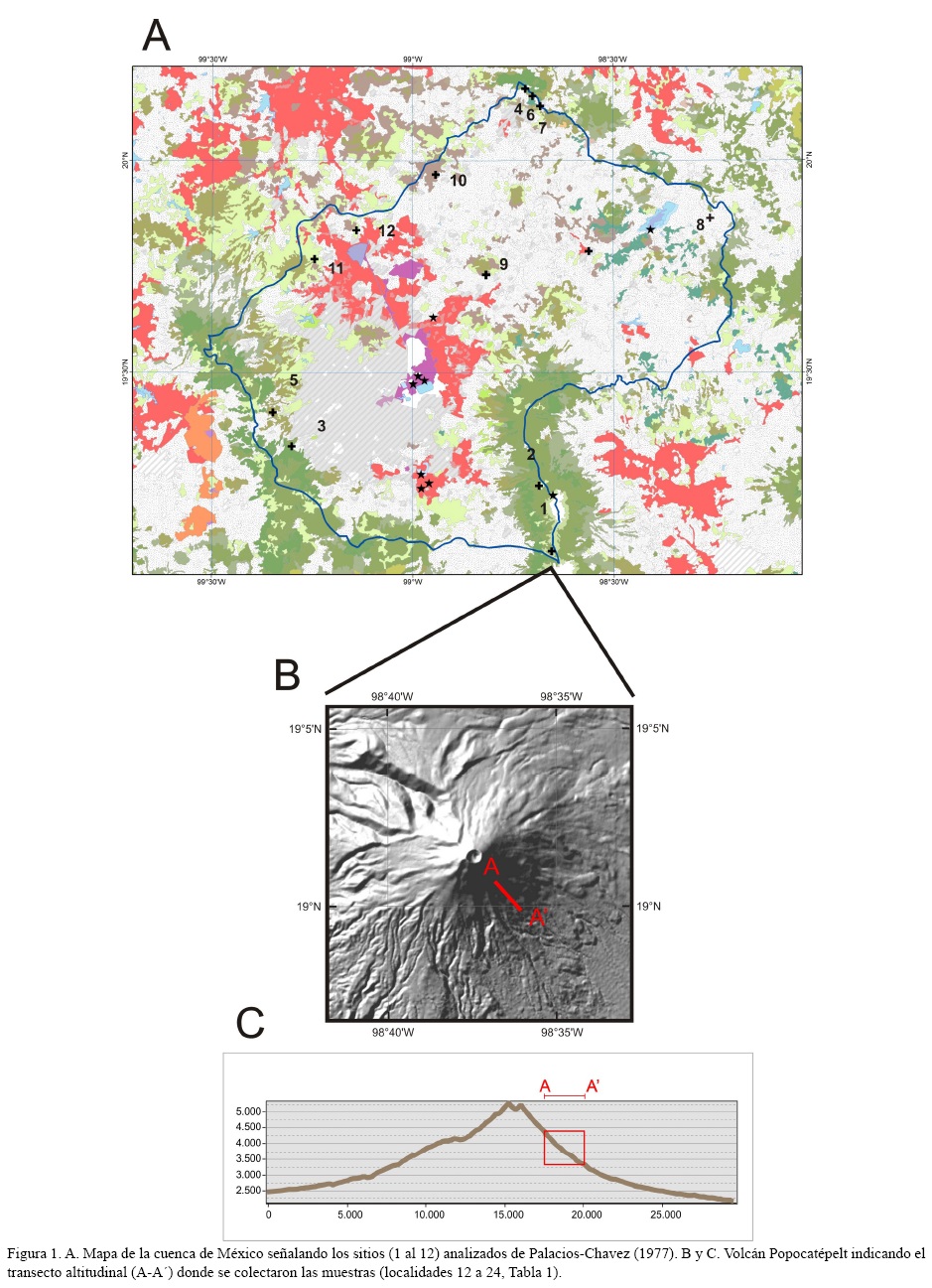 Se colectaron 12 muestras superficiales (musgo-suelo) siguiendo un transecto altitudinal en el Popocatépetl con orientación NO-SE (Figura 1) e incluyendo tres tipos de vegetación (sitios 13 a 24, Tabla 1). Los lugares de muestreo se seleccionaron siguiendo el método de levantamiento (relevé). Para constituir cada muestra se tomaron en cada levantamiento submuestras de cada vértice y centro de los levantamientos. Las muestras de superficie se secaron a 50°C durante 24h, se pesaron y se procedió a realizar la extracción de polen de acuerdo a métodos estándares (Faegri y Iversen, 1989). Los silicatos se eliminaron con HF durante 24 a 48 h, posteriormente fueron lavadas y se agregó KOH al 10 % durante 10 minutos para a continuación acetolizar durante 8 minutos a 70 °C. Las muestras fueron lavadas y neutralizadas y se llevó a cabo una separación por densidad con BrZn y el residuo fue montado en bálsamo de Canadá para el conteo posterior del polen al microscopio. Un mínimo de 250 granos de polen fueron contados en cada muestra. Los datos de lluvia de polen de las muestras de superficie se conjuntaron los datos de polen de la lluvia moderna de la CM publicados previamente por Palacios-Chavez (1977) en el que se incluyen 12 comunidades (sitios 1 a 12, Tabla 1). Con un total de 81 taxa se calcularon los porcentajes con el software Tilia (Grimm, 1992) el análisis de agrupamiento se realizó utilizando el programa Coniss que es un método de agrupamiento estratigráficamente delimitado (Grimm, 1987, 1992). El diagrama de polen se elaboró con Tiligraphincluyendo los taxa que tienen >1% y se presenta el dendrograma resultado del análisis de agrupamiento (Figura 2).