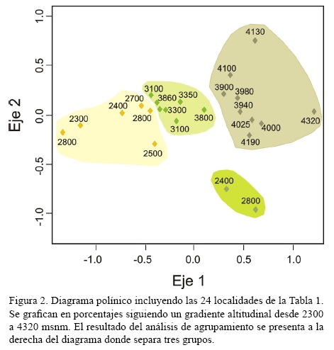 Los datos palinológicos se presentan en un diagrama siguiendo el gradiente altitudinal desde 2300 hasta 4320 msnm (Figura 2). El diagrama solamente incluye 58 taxa que corresponden a los elementos que alcanzaron porcentajes > 1%. El dendrograma agrupa las muestras de elevaciones bajas (2300 a ~2800 msnm), caracterizadas por taxa pertenecientes a los matorrales y pastizales que presentan bajos porcentajes (generalmente menores a 2 %). Entre estos, destacan Opuntia, Mimosa, Acacia, Yucca, Menodora, Dalea, Asteraceae y Poaceae. Juniperus es abundante entre 2500 a 2900 msnm. Otro conjunto lo constituyen las elevaciones medias de 2800 a 3100 msnm donde la mayor parte reduce sus porcentajes a excepción de Asteraceae y Quercus. Las elevaciones medias de 3100 a 3900 msnm constituyen otro conjunto donde el polen de Pinus, Abies, Alnus, Quercus alcanzan valores máximos y con porcentajes menores se encuentran: Celtis, Fraxinus, Cupressus, Juniperus, Potentilla, Prunus, Asteraceae y Amaranthaceae. Entre 4000 y 4320 msnm el espectro polínico se caracteriza por la presencia de Alchemilla, Conyza schieeana, Penstemon gentianoides, Draba jorullensis, Alnus, Brassicaceae, Caryophyllaceae y Poaceae aunque también se registran con menores porcentajes Pinus, Quercus, Abies, Alnus, Solanum y Cupressusy Amaranthaceae.