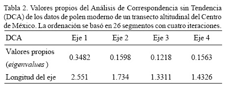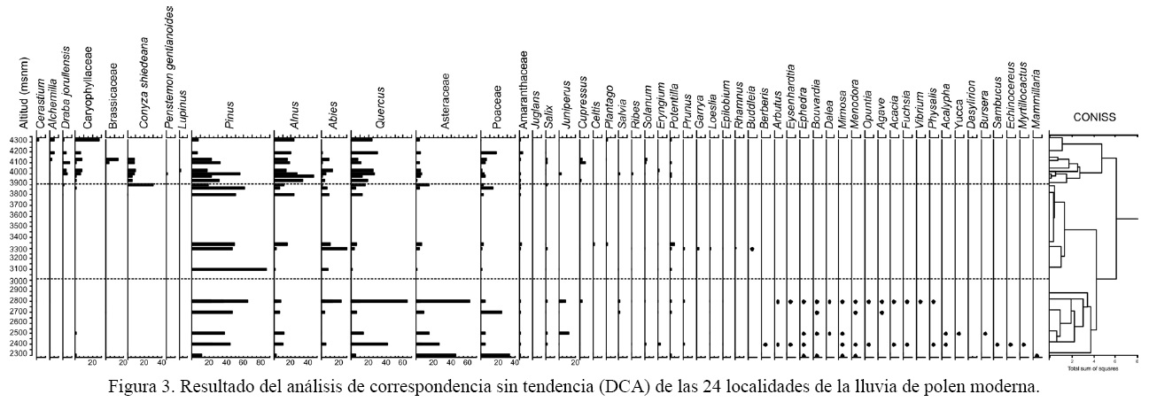 Para la vegetación de la cuenca de México, los intervalos altitudinales de la vegetación van desde 2250 hasta ~ 4000 msnm donde se establece el límite superior de los zacatonales alpinos en las montañas adyacentes a la cuenca (Popocatépetl e Iztaccíhuatl). Esta topografía impone límites a la distribución de los taxa que constituyen las comunidades que se desarrollan en la cuenca, lo que se ve reflejado en la composición de la lluvia de polen moderna lo cual se observa en patrones altitudinales definidos del diagrama palinológico (Figura 2). En las zonas bajas de la cuenca (2250 a ~ 2700 msnm) los espectros polínicos se caracterizan por la presencia, en bajos porcentajes de Acacia, Acalypha, Bursera, Menodora, Mimosa, Opuntia, Physalis y Yucca, algunos taxa tienen presencia esporádica en otras elevaciones como Menodora. El transporte de estos taxa polínicos hacia las zonas altas no ocurre, como se observa en el diagrama de lluvia de polen (Figura 2). Con porcentajes mayores se registran en elevaciones menores a 2700 msnm polen de Asteraceae (25-40 %) y Poaceae (5-35 %) ambos están constituidos por diferentes especies lo que explica su presencia en rangos altitudinales mayores. El resultado de la ordenación de los datos de la lluvia de polen moderna separa claramente las comunidades de las zonas bajas como son los matorrales xerofíticos, pastizales y bosques de juníperos de otras comunidades de mayor altitud al igual que hay una separación de los taxa de estas comunidades a través del DCA (Figura 3).
