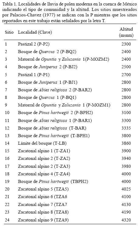 Palacios-Chavez, R., 1977, Lluvia de polen moderno en diferentes hábitats del Valle de México: Boletín de la Sociedad Botánica de México, 36, 45-69. [ Links ]