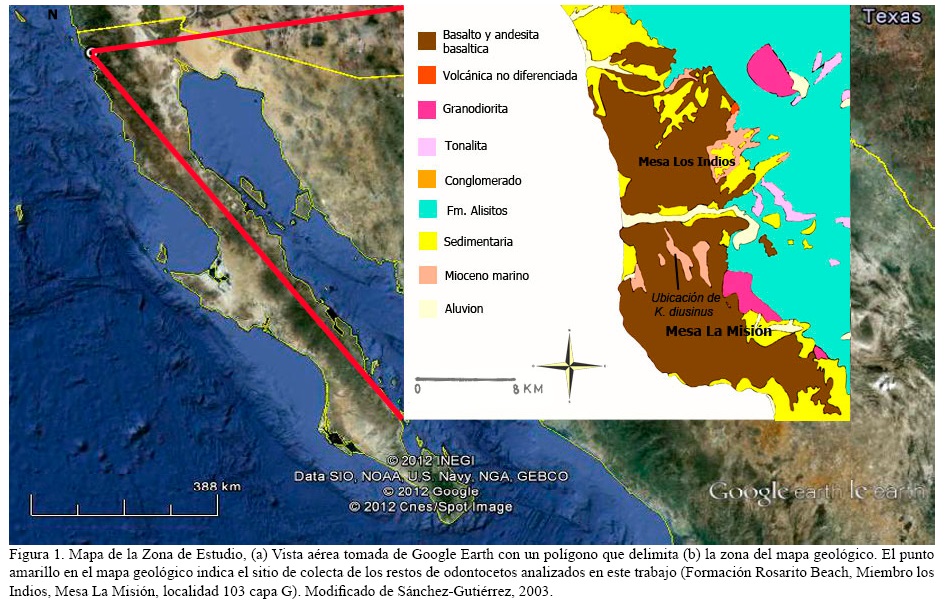 La zona de estudio es la Subcuenca La Misión, y está constituida por una secuencia transgresiva-regresiva de capas intercaladas de sedimentos marinos y no marinos. Con base a sus litologías se han distinguido cinco miembros que la conforman: Miembro Punta Mesquite, Miembro Medio Camino, Miembro La Misión, Miembro Los Indios y Miembro El Descanso (Ashby, 1989). El área de estudio corresponde al Miembro Los Indios. Este miembro aflora en las áreas al norte y sur del Arroyo Guadalupe. La localidad tipo fue descrita para la Mesa Los Indios en la región norte (Minch et al., 1984). La Mesa La Misión, al sur del Arroyo Guadalupe, muestra correlación con la estratigrafía de la localidad tipo, la cuál debe ser atribuida a la cercanía entre ambas localidades y concordancia de los procesos litogénicos (Aranda-Manteca, 2001). La localidad 103 de la Colección Paleontológica del Estado de Baja California se ubica al sur de la Mesa La Misión y está aflorando en el cañón más largo de la cuenca principal de drenaje de la Mesa. En esta localidad afloran las unidades denominadas C, D, E, F, G y H. La capa G es una arenisca tobácea, color gris claro a café anaranjado de 3.78 m de espesor, con sedimentos de arena fina. Esta capa contiene un horizonte de abundantes huesos (bonebed) que presentan evidencias de haber sido transportados (Aranda-Manteca, 2001). El organismo del presente trabajo fue colectado en esta capa.