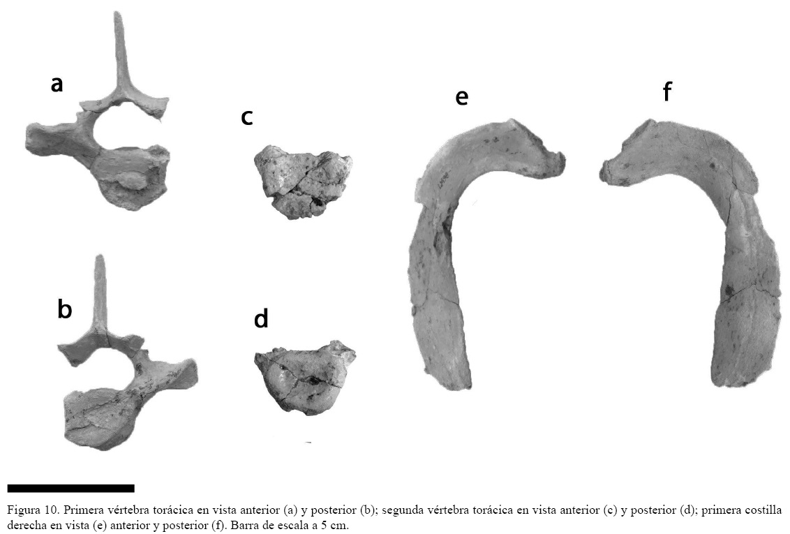De esta vértebra sólo se conserva el centro y la base de la espina neural (Figuras 10c y d). El centro es parecido en tamaño y forma a la primera vértebra torácica, mientras que la espina es más ancha anteroposteriormente y parece que hubiera sido más larga que la espina de la primera vértebra torácica si se encontrara completa.