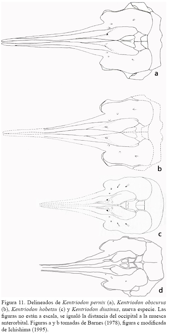 En vista dorsal el ancho del rostrum a la altura de la hendidura preorbital es similar en ambos especímenes (Figuras 11c y 11d, 12c y 12d); sin embargo, la hendidura preorbital es más amplia en Kentriodon hobetsu y el proceso preorbital tiene una forma redondeada en K. hobetsu y es más bien triangular en K. diusinus. La forma del basicráneo en vista dorsal de K. hobetsu es redondeada, mientras que en K. diusinus tiene un basicráneo más angular. También, los procesos zigomáticos están visibles dorsalmente en K. diusinus, mientras que no son visibles en K hobetsu. Los frontales en la porción del vértice craneal son subrectangulares en K. hobetsu y en K. diusinus tienen forma de gota, redondeados posterolateralmente y alargados anteromedialmente. Las premaxilas a la altura del supraorbital están más ensanchadas en K. hobetsu que en K. diusinus y el supraorbital es más cóncavo en K. diusinus. Lateralmente, se observa que el proceso preorbital en K. hobetsu es más grueso dorsoventralmente y el lagrimal está en una posición más inclinada. El hueso parietal difiere mucho en tamaño, siendo más pequeño en K. hobetsu. En vista ventral, la diferencia más resaltante es el tamaño y forma de los senos pterigoideos, son cortos con el borde anterior redondeado en K. hobetsu y en K. diusinus son muy alargados y se proyectan sobre el rostrum con el borde anterior terminado en punta. Otra diferencia es el tamaño de las fosas glenoides en el proceso zigomático, que son más cortas y con una constricción central en K. hobetsu lo que les da una apariencia de "8" y en K. diusinusson más alargadas y ovaladas.