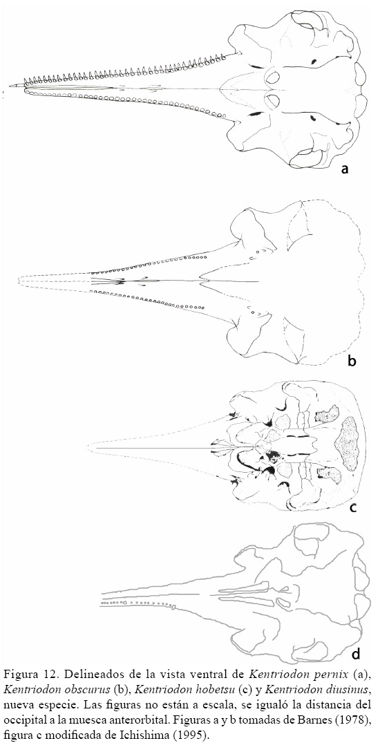 En primera instancia, el cráneo de K. diusinus presenta muchas similitudes con el de K. obscurus (Figuras 11b y d, 12b y 12d) y es al que más se parece de las tres especies de Kentriodon con las que se comparó el holotipo. Sin embargo, hay diferencias que impiden asignar el cráneo a esta especie. El rostrum es más ancho en K. obscurus a la altura de la hendidura preorbital. El foramen maxilar izquierdo se encuentra posterior a la hendidura preorbital en K. obscurus y anterior a ésta en K. diusinus. El proceso preorbital es triangular en K. diusinus y es trapezoidal en K. obscurus. Lateralmente, el rostrum es más grueso dorsoventralmente en K. obscurus, sin que exista evidencia de compactación, y el proceso postorbital se inclina ventralmente, mientras que en K. diusinus la inclinación es posteroventral. Los senos pterigoideos, que son la característica más relevante de este espécimen, también son largos con el borde anterior terminado en punta en K. obscurus pero no se proyectan tan anteriormente como lo hacen en K. diusinus.