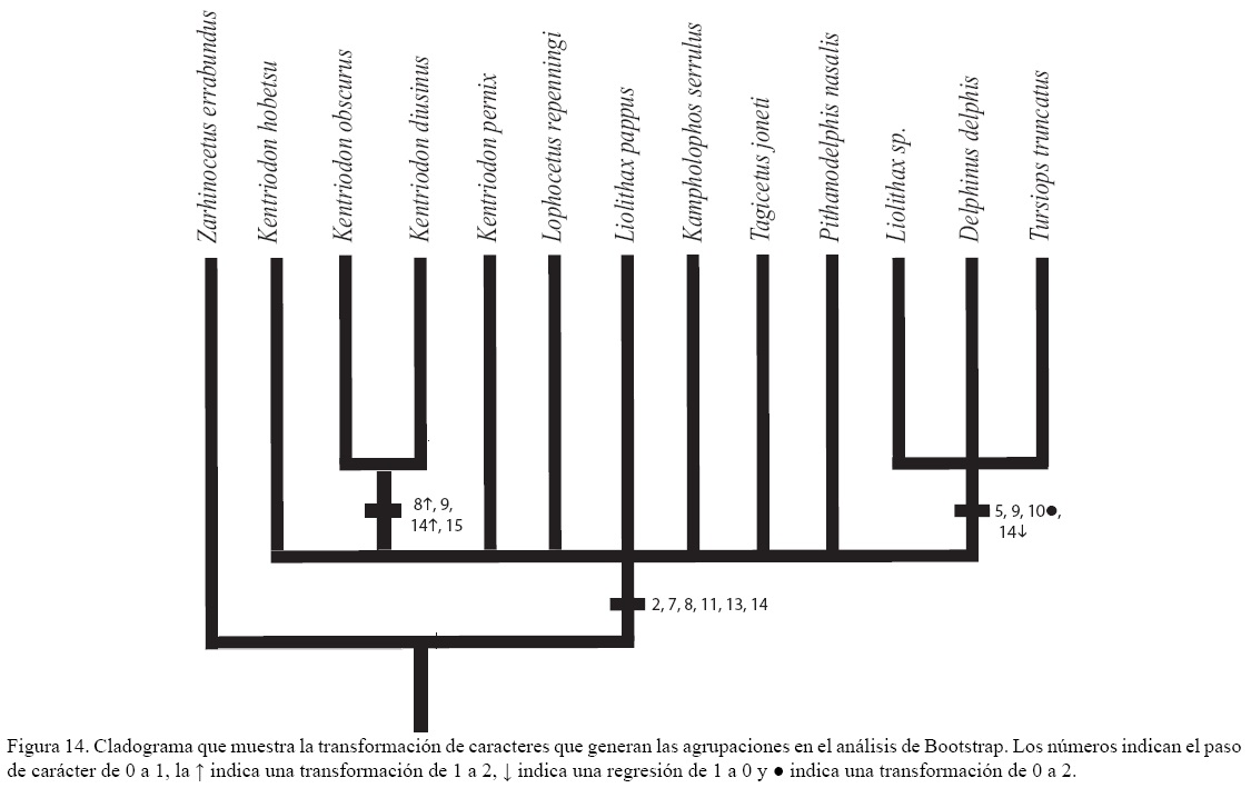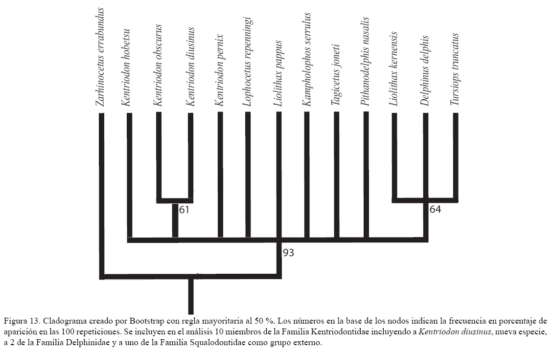 Del análisis filogenético se obtuvieron 26 árboles igualmente parsimoniosos de 2800 pasos cada uno (resultados no mostrados) pero las topologías variaban y los índices de consistencia y de retención presentaban valores bajos (< 0.60). Con el análisis de "Bootstrap" con 100 réplicas y usando la opción de algoritmo de cambio de ramas (Branch-swaping algorithm, TBR), se obtuvo un árbol de consenso con regla mayoritaria del 50 %. En el árbol obtenido, (Figura 13) solo se mantienen dos agrupaciones: una con Kentriodon obscurus y Kentriodon diusinus con una frecuencia de ocurrencia de 61%, y el otro es el clado que agrupa a una politomía entre Liolithax sp., Delphinus delphis y Tursipos truncatus con una frecuencia de 64 %. Fuera de estos 2 clados, se mantiene con una frecuencia de 93 %, una politomía que incluye a todas las especies ocupadas en el análisis con excepción del grupo externo. Cuando se hace la reconstrucción de los caracteres se observa que los caracteres que agrupan a K. diusinus y K. obscurus son: una muesca aterorbital profunda y angosta, la anchura zigomática como porcentaje de la longitud condilobasal es mayor a 45 %, los senos pterigoideos son largos y el ápice del seno medio es punteado. Los caracteres que agrupan a Liolithax sp., Delphinus delphis y Tursiops truncatusson: margen lateral del rostro convexo, la anchura zigomática como porcentaje de la longitud condilobasal es mayor a 45 %, vértice craneal torcido hacia la izquierda y seno pterigoideo corto (Figura 14).