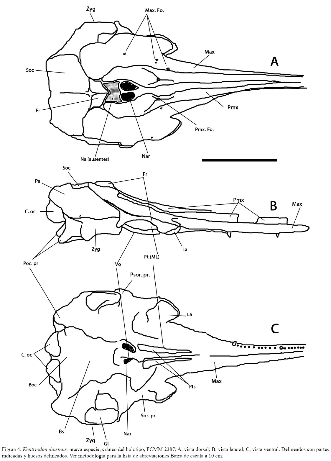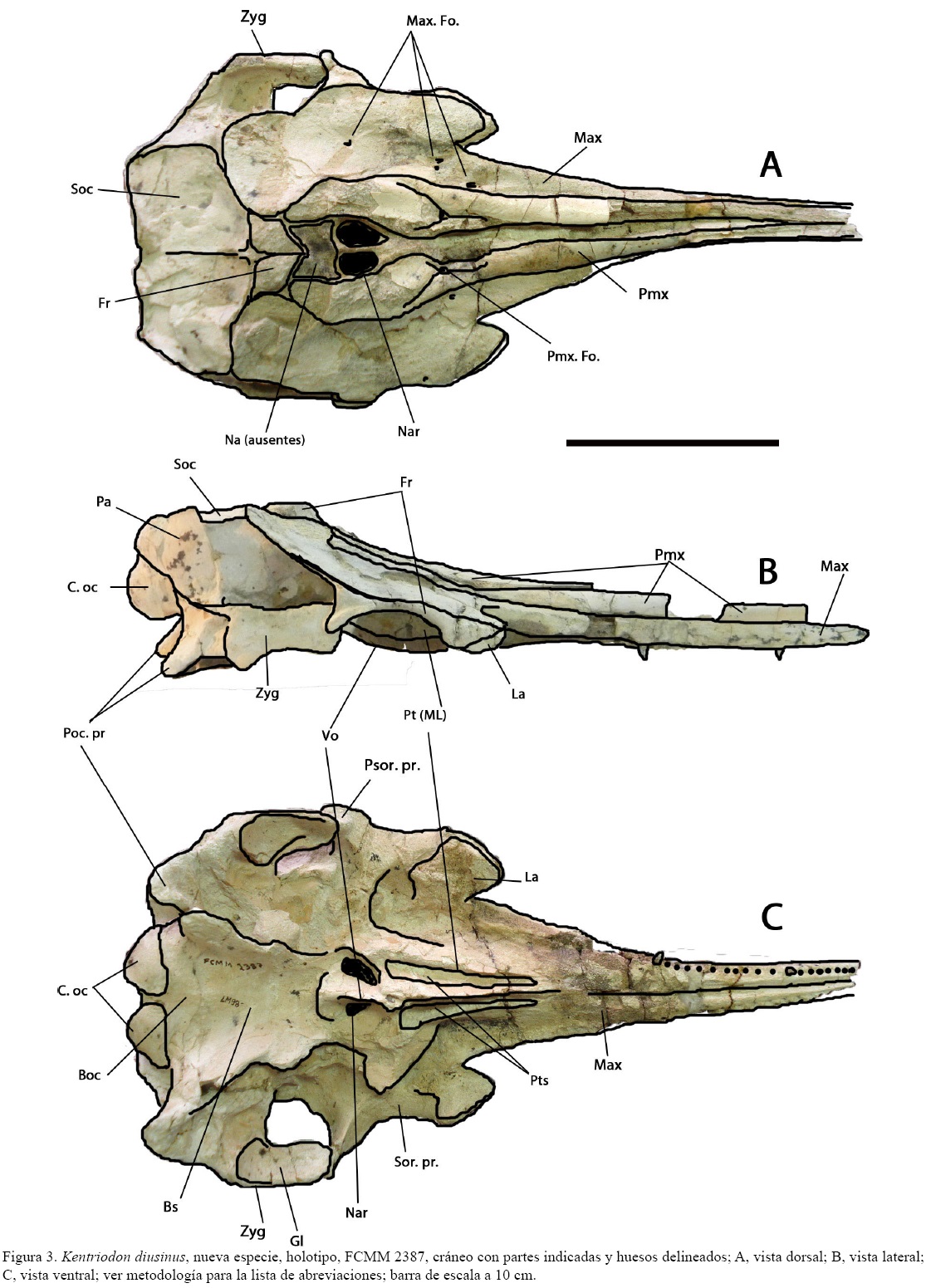 Las medidas tomadas de los elementos de FCMM 2387 (Tabla 1) se hicieron basándose en la metodología descrita por Perrin (1975). Los huesos y estructuras anatómicas están señaladas de acuerdo a las siguientes abreviaturas: Aon, hendidura preorbital; Boc, basioccipital; Bs, basiesfenoides; C. oc, cóndilo occipital; Fo., foramen; Fr, frontal; Gl, fosa glenoide; La, lagrimal; Max, maxila; Na, nasales; Nar, narina; Pa, parietal; Pmx, premaxila; Poc, paraoccipital; Pr., proceso; Pro, preorbital; Psor, postorbital; Pt, Pterigoides; Pt(ML), Lámina media del pterigoides; Pts, fosa para el seno pterigoideo; Soc, supraoccipital; Sor, supraorbital; Vo, vómer; Zyg, zigomático.