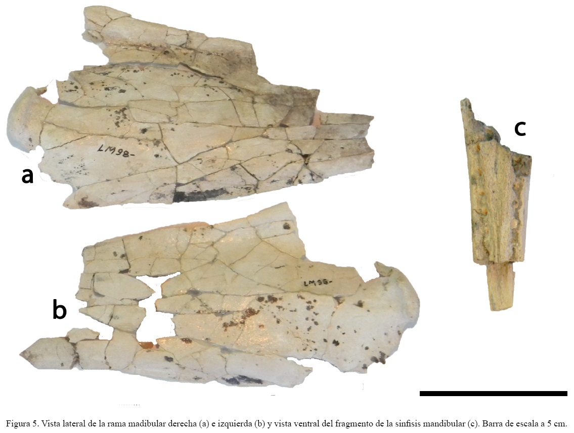Ambos dentarios (Figura 5) están rotos y solo se conserva la parte posterior de cada rama mandibular y 4 cm de la parte anterior. El fragmento de la parte anterior de la mandíbula tiene 6 alveolos dentales en la parte derecha y 5 alveolos en la parte izquierda. De los 5 alveolos izquierdos se conservan en su sitio las raíces de 3 dientes. El fragmento, que comprende parte de la sínfisis, tiene una forma semicircular en vista anterior o posterior con un pequeño surco en la parte medial que se forma por la unión de ambas ramas mandibulares. En vista posterior es posible ver dos canales que corren por el centro de cada rama mandibular y llegan hasta donde estarían las raíces dentales. La parte posterior de ambas ramas mandibulares está muy fragmentada y solo se conservan algunos de los elementos. En la rama derecha es posible ver el proceso coronoide que se levanta con una suave pendiente, pero la parte posterior de este proceso no está conservado. En la rama izquierda el proceso coronoide se ha roto y no está unido al resto de la mandíbula. El cóndilo mandibular en ambas ramas está incompleto pero se conserva la parte lateral que es más gruesa y resistente que otras partes de la rama mandibular. Las fosas mandibulares se han roto y no es posible medir la distancia que hay entre ésta y el cóndilo mandibular.