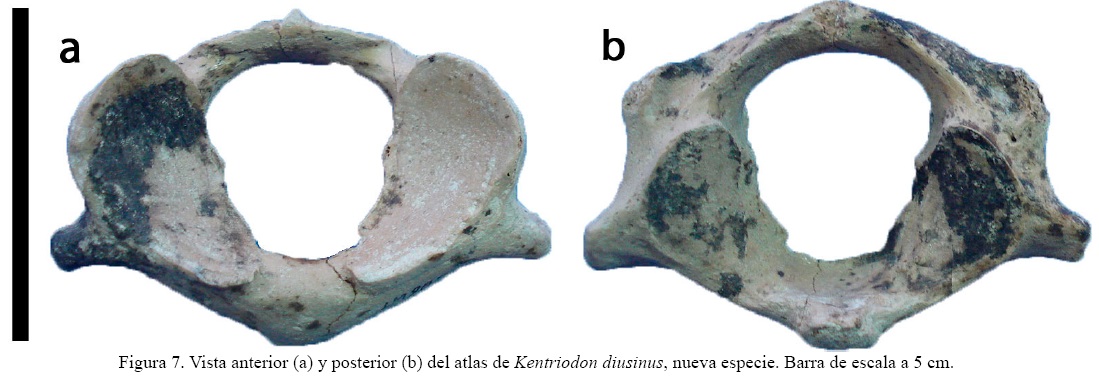 El atlas es pequeño siendo dos veces más alto que largo (Figura 7). La espina dorsal está muy poco desarrollada, los procesos inferiores son robustos y se proyectan lateroventralmente, mientras que los procesos superiores están rotos, así que no es posible saber que tanto se proyectaban. El arco neural es delgado anteroposteriormente. Las facetas anteriores son subovoidales siendo más anchas en la parte superior que en la inferior y están separadas por un arco amplio. El canal que se forma en el centro del atlas tiene una forma subovoidal y es amplio en la parte superior y un poco más angosta en la parte inferior. Las facetas posteriores son ligeramente cóncavas. El proceso hiapofisial es corto y grueso y en su parte superior hay una faceta ligeramente distinguible con una forma subtriangular para la articulación con el axis.