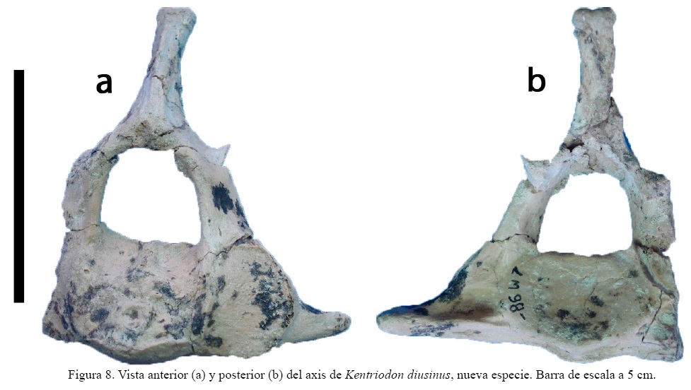 En el axis (Figura 8) la espina neural es gruesa e inclinada posteriormente y el arco neural forma un semicírculo. La faceta de articulación con el atlas del lado izquierdo se ha perdido y la derecha es ligeramente convexa. El proceso inferior derecho es grueso en la base y se va adelgazando a medida que llega a la parte más distal y está inclinado posteriormente. El centro del axis tiene una pequeña depresión en forma circular. Posteriormente, el centro del axises cóncavo y la parte posterior del proceso inferior forma una cavidad subovoidal. En la parte inferior del axis hay dos depresiones que están separadas por un borde medial que corre anteroposteriormente a lo largo de toda la parte ventral.