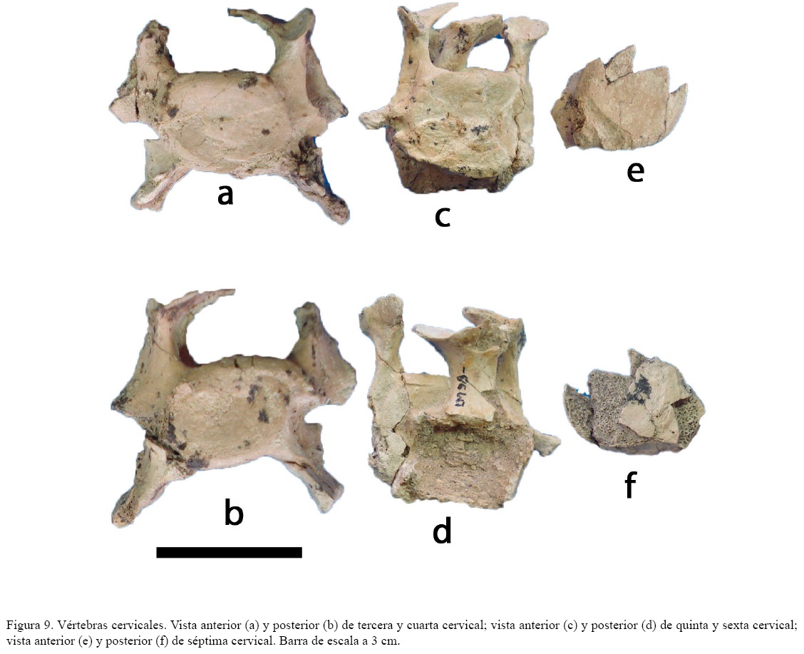La sexta vértebra cervical está mucho más dañada (Figura 9d). Sólo se conserva un pequeña parte del centro y un proceso transversal inferior. Este proceso es grueso, ligeramente aplanado dorsoventralmente y se ensancha en el ápice anteroposteriormente para formar una superficie plana de articulación con el proceso transversal inferior de la quinta y séptima vértebras cervicales.