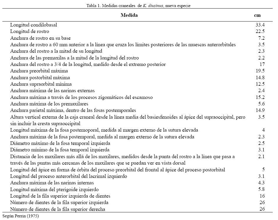 Las características craneales que presenta el holotipo de Kentriodon diusinus, nueva especie, son congruentes para el género Kentriodon (ver Barnes, 1978). Así mismo, las características que presenta para la especie Kentriodon obscurus son muy similares a las características del holotipo de Kentriodon diusinus; sin embargo, si existen diferencias suficientes como para separarlo de esta especie: el supraorbital no es tan grueso ni arqueado como K. obscurus, el palatino y las fosas de los senos pterigoideos se extienden aún más anteriormente. La falta del hueso periótico en el holotipo de K. diusinushace imposible una comparación de este elemento para esclarecer aún más las similitudes y diferencias entre estas dos especies.