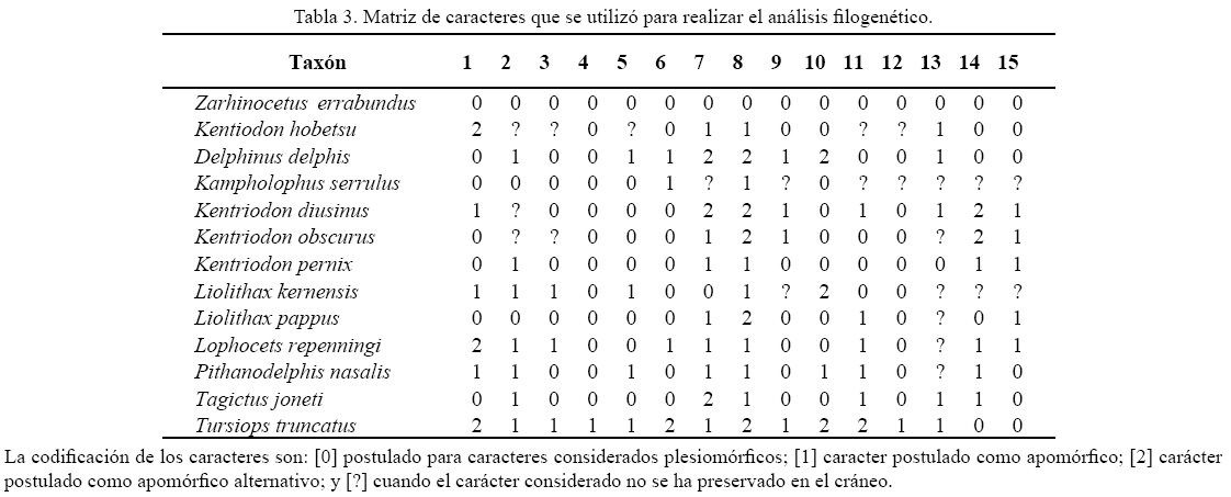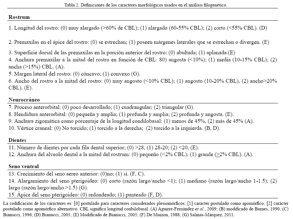 Los caracteres y estados de carácter se tomaron parcialmente de los trabajos de De Muizon (1988), Barnes (1990), Bianucci (2001, 2005), y Aguirre-Fernández et al., (2009). Algunos caracteres y estados de caracter fueron modificados y otros se proponen en el presente trabajo por primera vez (Tabla 2 y 3).