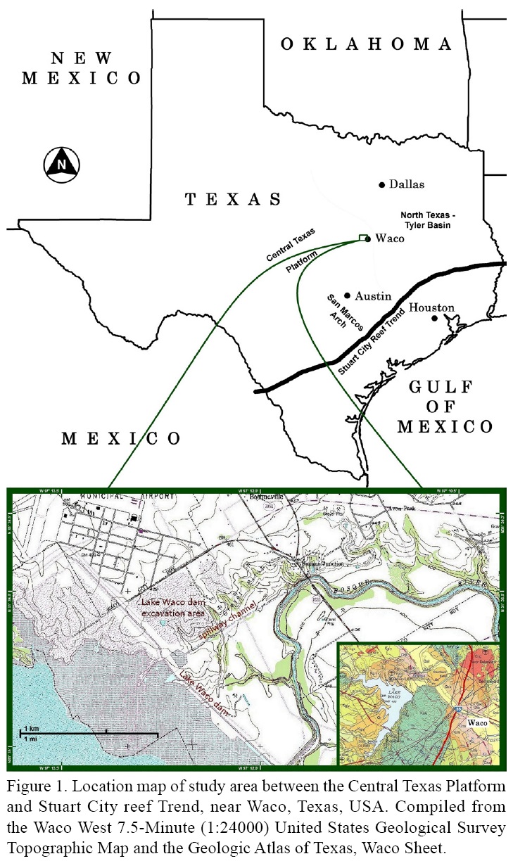 The locality is found near the Lake Waco dam in Waco, Texas, USA. It is situated between the Central Texas Platform, Stuart City Reef Trend and North Texas - Tyler Basin (Figure 1). The Grayson Formation, at this locality, is uniform in thickness and consists of calcareous claystone interbedded with mudstone overlain by claystone interlaminated with pyritic or limonitic seams, and capped by calcareous claystone interbedded with siltstone and nodular wackestone (Figure 2). These types of sediments and the presence of microfauna are indicative of a low energy muddy substrate environment (Mancini, 1978) that combined with microreducing conditions contributed to the exceptional preservation of fossils at this locality (Mancini, 1978).
