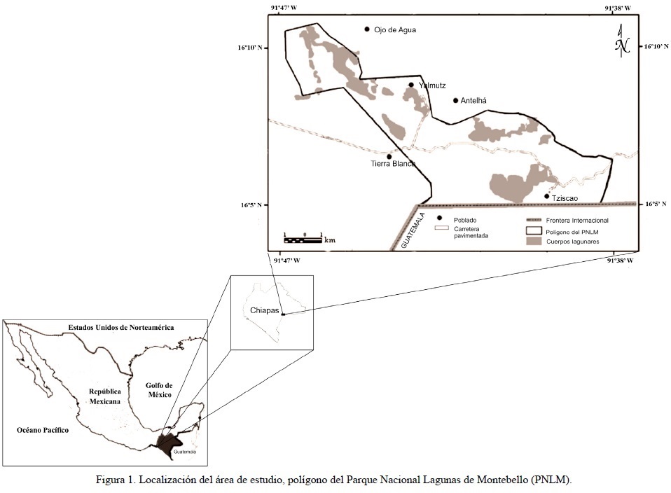La zona de estudio se localiza al sureste del Estado de Chiapas, muy cerca del límite fronterizo con Guatemala. Entre los paralelos 16º 5' y 16º 10' de latitud norte y los meridianos 91º 38' y 91º 47'de longitud oeste (Figura 1). El Parque Nacional Lagunas de Montebello cubre un área total de unos 60 km2y se distribuye a lo largo del intervalo altitudinal de 1200 ‒ 1800 msnm. El clima predominante en la zona de estudio es templado húmedo a subhúmedo con lluvias todo el año (García-Amaro, 1988). La temperatura media anual es de ~17 ºC y la precipitación total anual es de ~1800 mm (CONANP, 2011). Estas condiciones climáticas características de la zona favorecen una diversidad en el tipo de suelos, vegetación y fauna que se puede encontrar en el parque. Los tipos de suelo son: litosoles, rendzinas, vertisoles, acrisoles, fluvisoles y gleysoles (Vázquez-Sánchez y Méndez-Gómez, 1994). La vegetación se engloba dentro del bosque de clima templado, cuyas asociaciones son: bosque de coníferas, bosque de latifoliadas, bosque mesófilo de montaña, vegetación riparia y zonas de cultivo (Inventario Forestal Nacional, 2000-2001).