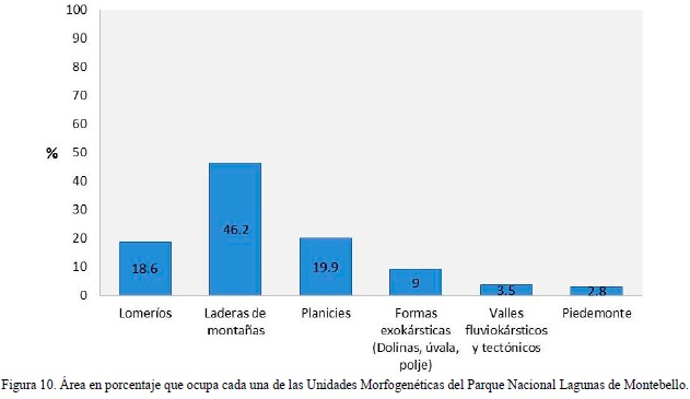 De las unidades morfogenéticas descritas en el presente trabajo, las laderas de montaña y los lomeríos ocupan un 64.8 %, las planicies y piedemonte 22.7 % y las formas kársticas ocupan el 12.5 %, del total del área estudiada (Figura 10).