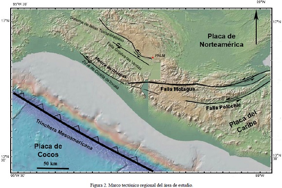 En un marco geológico regional, el área de estudio se localiza en la provincia tectónica de Fallas de Transcurrencia del Cinturón Chiapaneco de Pliegues y Fallas (Ortega-Gutiérrez et al., 1992), cuya tectónica está estrechamente relacionada con la interacción entre las placas de Cocos, Norteamérica y Caribe (Figura 2). La placa de Cocos subduce a las placas Norteamérica y Caribe a lo largo de la trinchera mesoamericana, mientras que el límite entre la placa Caribe y Norteamérica está representado por el sistema de fallas Polochic-Motagua (Gúzman-Speziale y Meneses-Rocha, 2000). Esta región ha estado sujeta a diversos procesos geológicos como son la sedimentación, plegamiento y fallamiento (Arellano-Contreras y Jiménez-Salgado, 2011; Padilla-Sánchez, 2007). Todos estos eventos actuaron en diferentes periodos de tiempo con distintas direcciones de esfuerzos y generaron el estilo de deformación que conforma el marco tectónico-estructural actual de la región en la que se encuentra el Parque Nacional Lagunas de Montebello.
