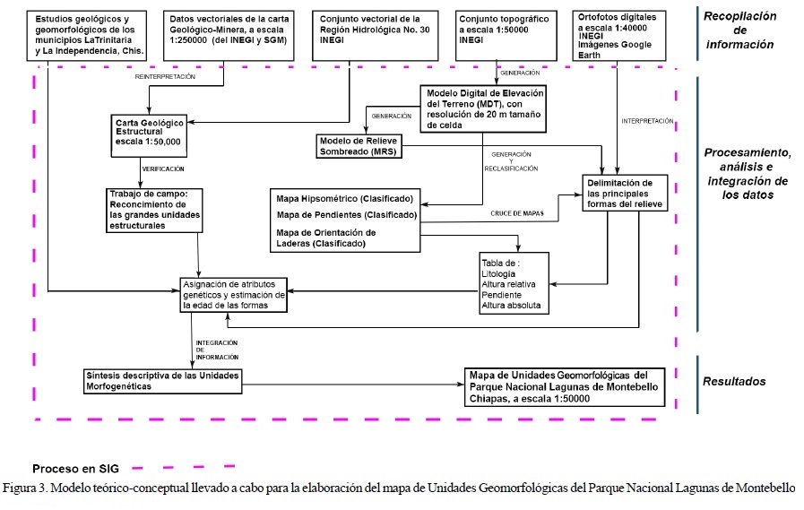 Para la elaboración de la cartografía geomorfológica del Parque Nacional de Lagunas de Montebello, se empleó una metodología teórica-conceptual (Figura 3) basada en la integración de algunos principios de las propuestas metodológicas del ITC-Enschede, con los aportes de Verstappen y Van Zuidam (1991), así como de Lugo-Hubp (1988), de Pedraza-Gilsanz (1996) y de Peña-Monné (1997). De esta manera, la metodología utilizada en este estudio presenta una estructura apoyada en las tres etapas que se detallan a continuación: