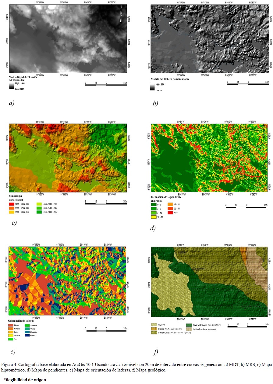 La información obtenida en esta etapa, se apoyó principalmente en análisis realizados con el SIG Arc Gis 10.1 (ESRI, 2013). Los datos de entrada que se utilizaron para iniciar los análisis de gabinete fueron las capas topográficas. A partir de éstas se elaboró un conjunto de capas temáticas base, en el que se incluyen el modelo digital de elevación del terreno (MDT), el modelo de relieve sombreado (MRS), el mapa hipsométrico, el mapa de pendientes y el mapa de orientación de las laderas (Figura 4a y 4b).