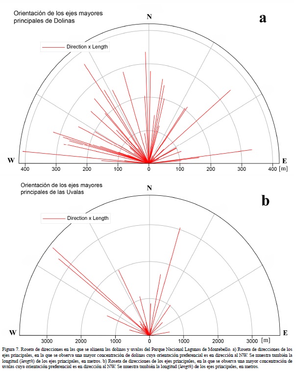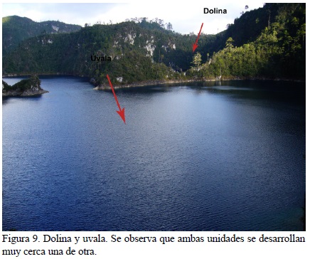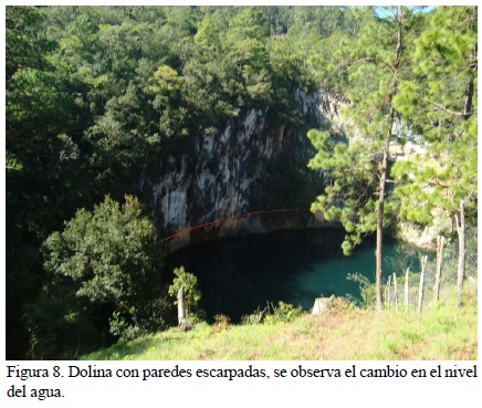 Del mapa geomorfológico presentado en este trabajo, se puede observar que existen dos grupos de dolinas y uvalas que sugieren una génesis y evolución diferente. El primer grupo (Figura 5; grupo A) está constituido por los cuerpos localizados en la porción NW ‒ SE de la zona de estudio. Éstos presentan morfologías alargadas e irregulares. Estas depresiones están ocupadas por agua, la cual en algunos casos alcanza los 200 m sobre la base de la dolina o uvala y sus paredes son casi verticales. En el segundo grupo (Figura 5; grupo B) aparecen los cuerpos que se encuentran en la porción norte y que carecen de agua superficial. Éstos presentan paredes verticales con límites difusos, topográficamente se encuentran a mayor altitud que las del primer grupo y su morfología es irregular a circular.