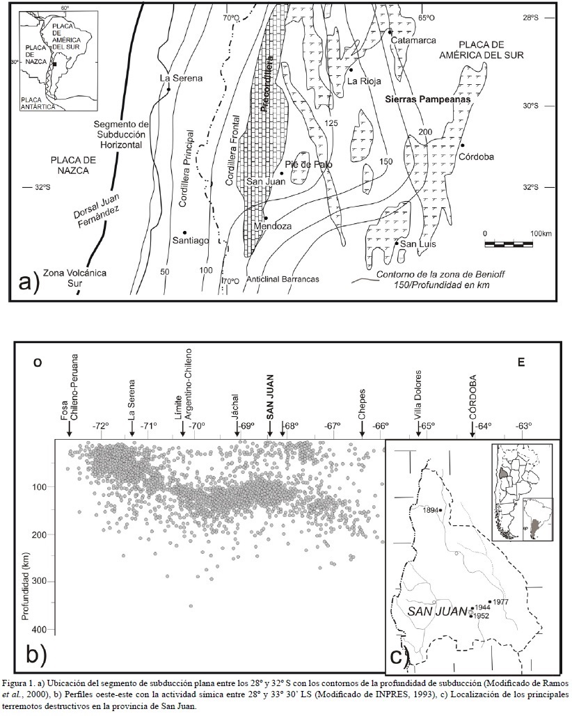 En Argentina, a causa de la interacción entre las placas de América del Sur, Antártica y Nazca, se producen complejos procesos donde distintos factores geológicos controlan el régimen de esfuerzos y deformaciones, por lo que el margen occidental del continente sudamericano presenta una topografía y sismicidad típica de margen activo. A partir de los 28° y hasta los 33° de latitud sur, se produce un aumento de la actividad sísmica. Allí, la placa oceánica subduce hacia el este, con ángulo menor a 10°, hasta una profundidad de 100 km aproximadamente, donde toma una posición subhorizontal (flat slab) (Figura 1a). Dentro de este segmento donde la geometría de subducción es subhorizontal, se desarrolla casi el 80 % de la deformación cuaternaria argentina documentada (Costa et al., 2000).