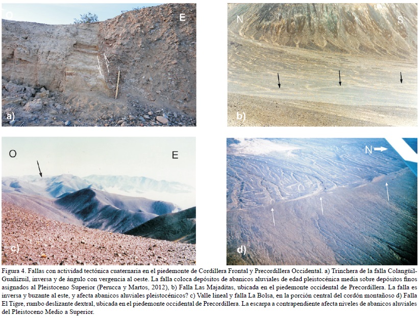 Al noroeste de la provincia de San Juan, en el piedemonte oriental de Cordillera Frontal se ubican fallas paralelas de rumbo NE, que afectan depósitos aluviales cuaternarios (Perucca et al., 1999; Perucca y Martos, 2012). Las principales son: fallas Infiernillos (1), Cachiyuyal (2), Colangüil-Guañizuil (3) (Figuras 3, 4a), Pismanta-Las Flores (4) y Bella Vista-Angualasto (5) (Figura 3). Existen fallas con rumbo NO y NE subordinadas a las anteriores. Al sur del río San Juan se reconocen fallas inversas de rumbo N20ºE que buzan entre 30 y 75º O, como las fallas Río Castaño-Villa Nueva (6).