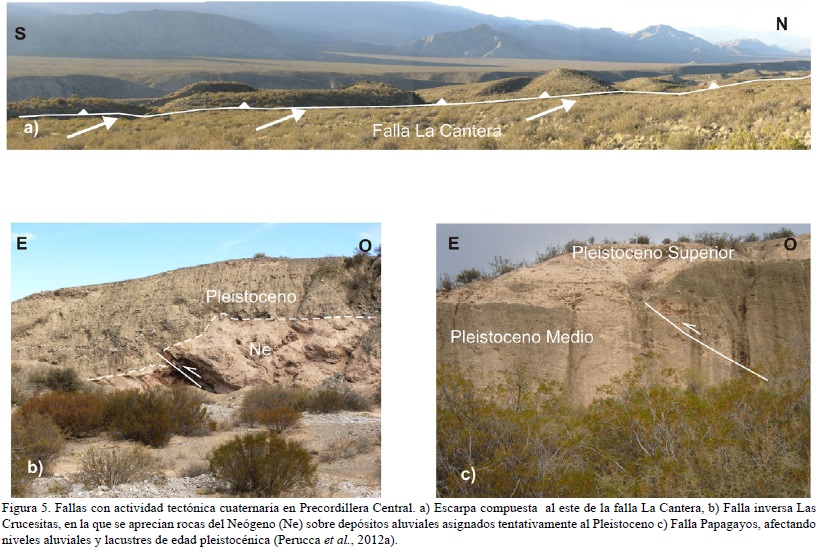 En el ámbito de Precordillera Central se destaca la falla La Cantera (16), que inclina al oeste y desplaza depósitos aluviales del Pleistoceno-Holoceno (Mingorance, 1994, 1998; Millán y Perucca, 2011). Presenta geoformas características que evidencian su actividad neotectónica, tales como cauces "colgados" y obturados, escarpas de falla, escarpas de flexión y lagunas de falla (sag ponds), entre otras (Figuras 3, 5a). La falla inclina entre 10ºO en la porción norte a 30ºO hacia el sur. La escarpa de la falla principal posee una altura promedio de 14 m. La longitud total de la falla es de 47 km, su rumbo promedio N20ºE y afecta niveles aluviales del Pleistoceno Superior-Holoceno. Millán y Perucca (2011) dataron un nivel edáfico incipiente afectado por la falla, obteniendo una edad C14no calibrada de 4580 ± 50 años AP, lo que correspondería al Holoceno medio. Finalmente, un pequeño cauce actual deflectado por un escarpe de 0.30 m podría corresponder al sismo de 1924 (M 6.0).