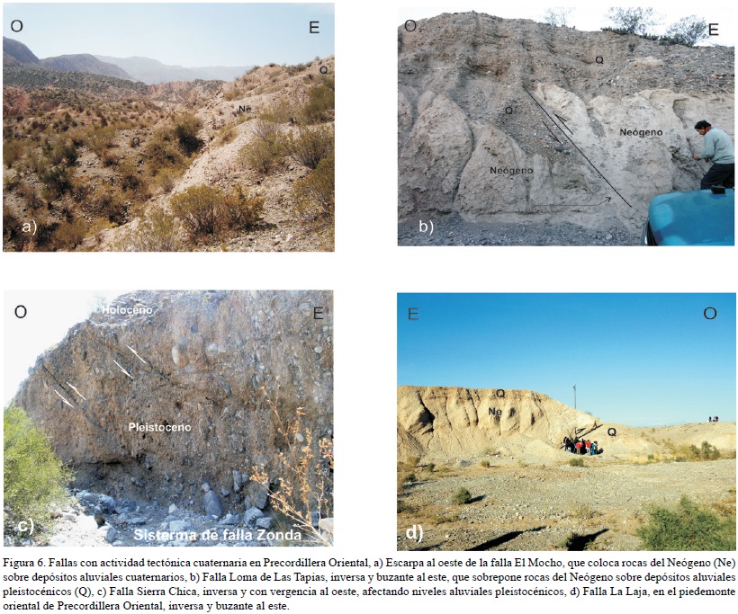 En el piedemonte oriental de la Precordillera Oriental, la zona de fracturación moderna constituye un sistema de fallas inversas con escarpas subparalelas, en general, en contra de la pendiente regional. Las fallas poseen un rumbo promedio N40ºE, en superficie inclinan aproximadamente entre 30º y 45º E y afectan los distintos niveles de abanicos aluviales. La falla La Laja (30) está vinculada al sismo del 15 de enero de 1944, de Ms 7.0 (Figuras 3, 6d). La ruptura superficial asociada se estimó entre 6 y 8 km y el desplazamiento vertical entre 30 y 60 cm (Castellanos, 1945; Perucca y Paredes, 2003). Un análisis detallado efectuado por Ragona (2007) en trincheras artificiales, datadas por OSL y C14 dio como resultado la ocurrencia de nueve eventos de deslizamiento de la falla para los últimos ~32 ka. Este autor concluyó que la recurrencia promedio para los últimos ocho intervalos es de 4.1 ± 0.5 ka, coincidente con la determinada entre los eventos individuales.