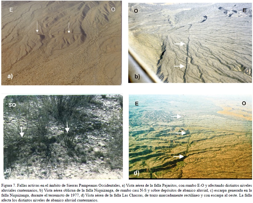 En el ámbito de Sierras Pampeanas, en el piedemonte septentrional de la sierra de Pie de Palo se ubica la falla Pajaritos (36), de rumbo E-O y desplazamiento sinestral, que afecta los abanicos aluviales provenientes de esta sierra (Figuras 3, 7a), mientras que en el extremo sureste de la sierra, se ubica la falla Niquizanga (37) (Figuras 3, 7b) (Perucca y Paredes, 2004). La escarpa de la falla Niquizanga tiene su cara libre hacia el oeste, las alturas oscilan entre 3 y 7 m; afecta niveles de terraza y abanicos aluviales. La longitud total de la falla es de 20 km. Durante el sismo de 1977, se produjo un nuevo desplazamiento y las nivelaciones geodésicas revelaron la existencia de una deformación permanente del suelo de 1.20 m, mientras que el desplazamiento de las escarpas no superó los 0.30 m (Figura 7c).
