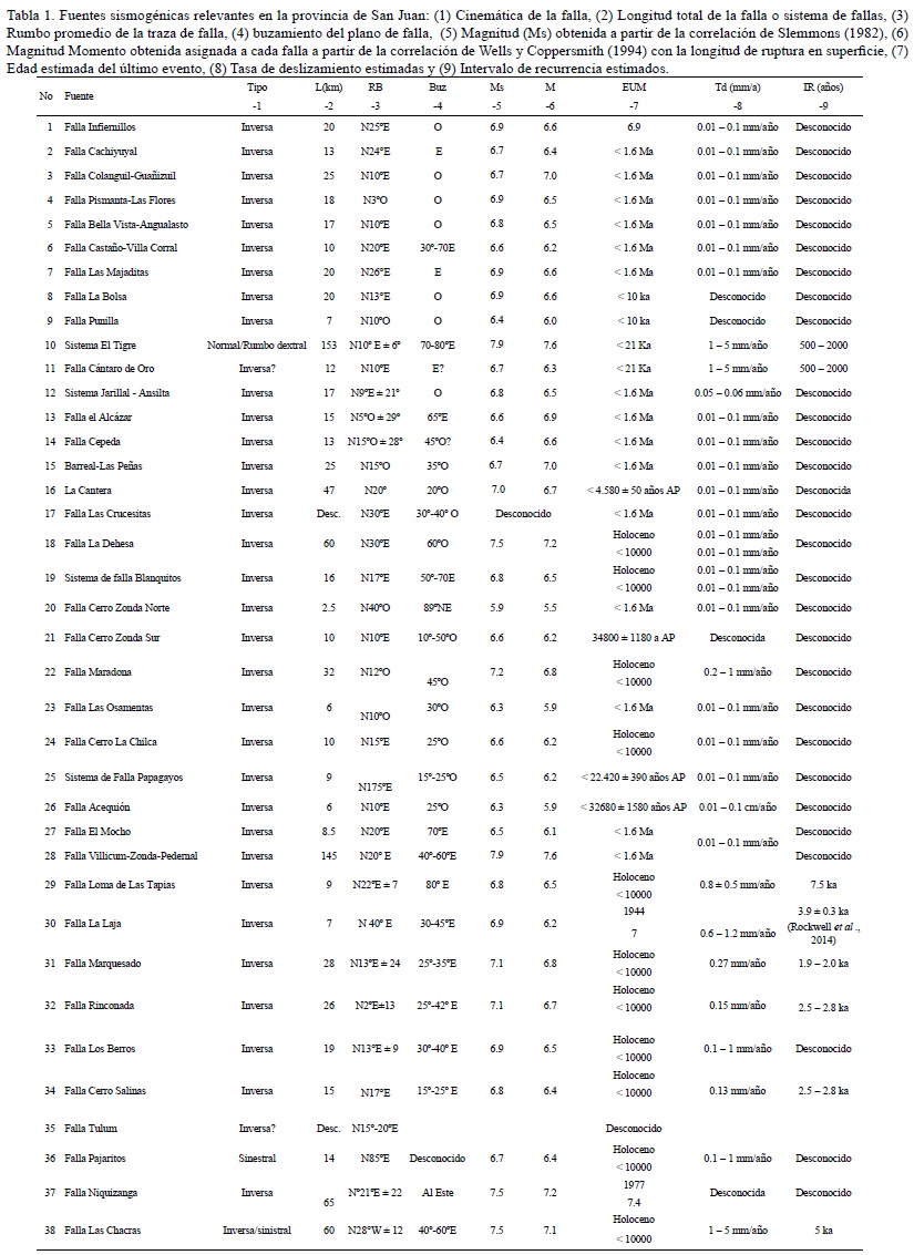 La provincia de San Juan, en el centro-oeste de Argentina, posee numerosas evidencias de fallas con actividad tectónica cuaternaria. Las discontinuidades estructurales a lo largo de Cordillera Frontal, Precordillera y Sierras Pampeanas, determinan las diferentes características superficiales de las deformaciones cuaternarias, que a la vez producen distintos escenarios paleosísmicos. La mayor parte de estas deformaciones y estructuras sismogénicas, actualmente conocidas en el territorio argentino, se ubican dentro de un cinturón sísmico definido entre Cordillera Frontal y Sierras Pampeanas Occidentales (27º ‒ 33º de latitud sur). Esta región también constituye un área con interacciones complejas entre estilos estructurales de piel fina y gruesa. Los sismos más destructivos en los últimos 120 años (M 7.5, en octubre de 1894; M 7.0, en enero de 1944; 6.8, en junio de 1952; y M 7.4 en noviembre de 1977) se han ubicado en esta zona.